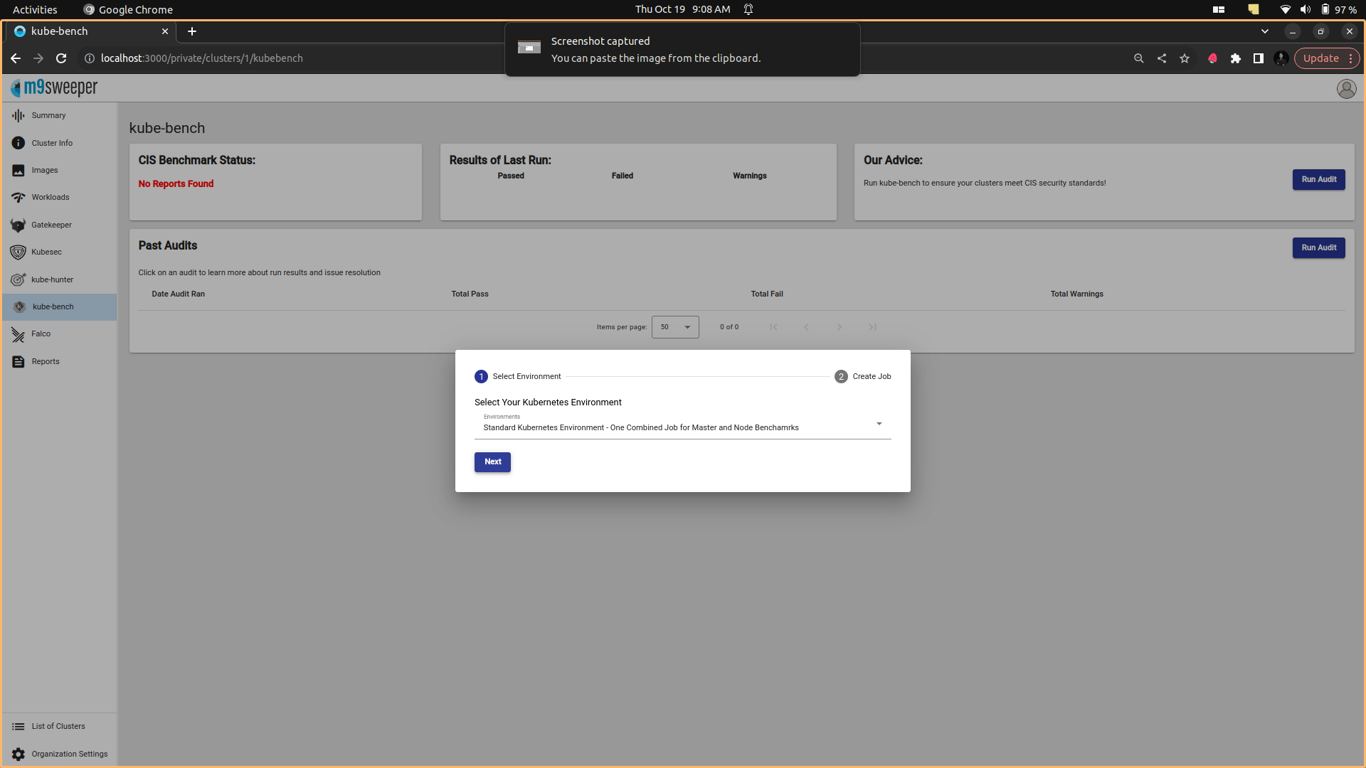 Fig: M9Sweeper Dashboard - Choose the cluster for security checkup